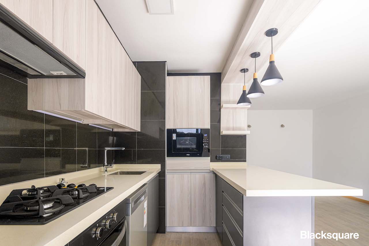 El departamento cuenta con un amplio living comedor con cocina americana, está última de gran amplitud y con equipamiento de última generación. Tiene conexión para lavadora y lavavajilla.