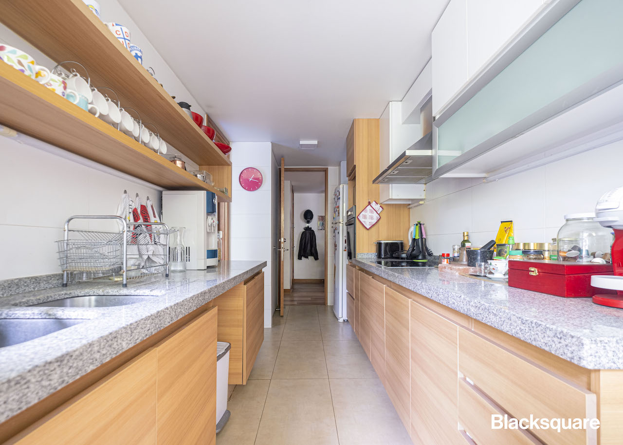 La cocina, totalmente equipada, tiene cubiertas de granito, dormitorio de servicio con su baño y logia.